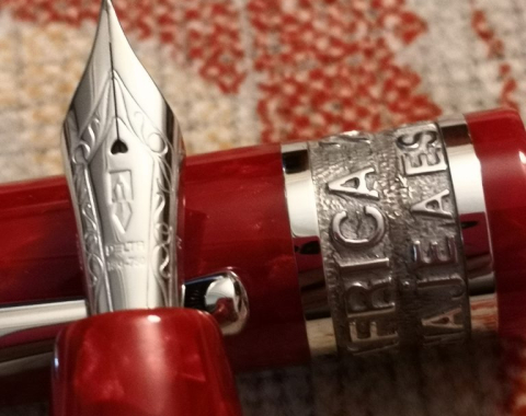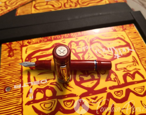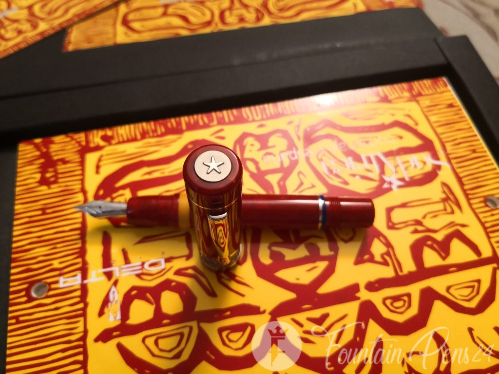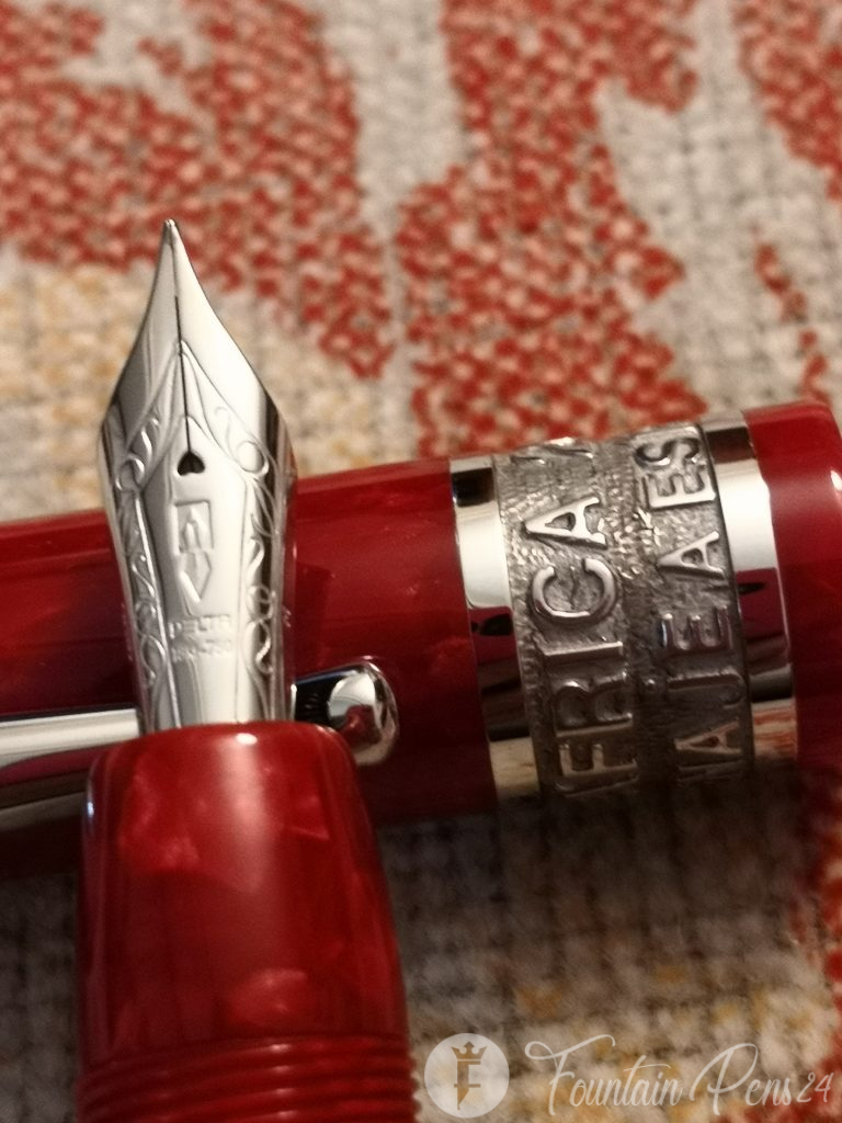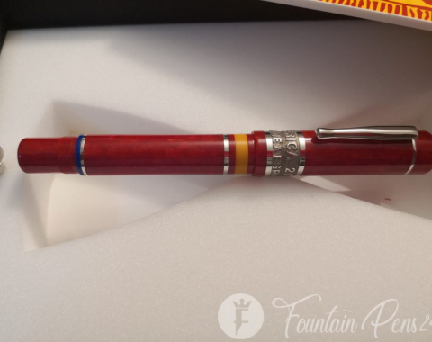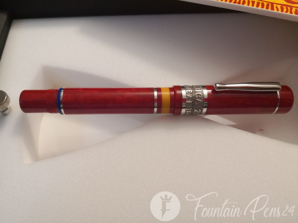The Limited Edition Delta South Africa 2010 “Tribute to Spain” fountain pen is made, both the cap and the barrel, with a very fine marbled red resin, which is turned by hand from a solid block and polished to a mirror shine, which gives it a shiny finish like crystal.