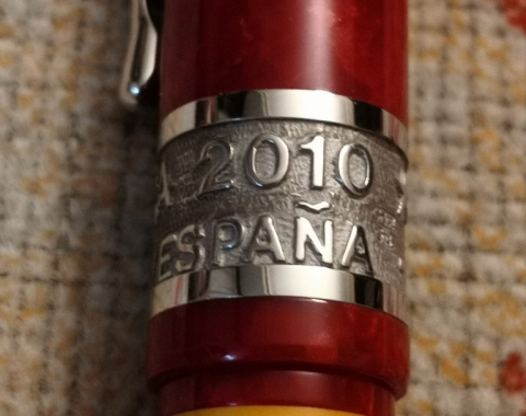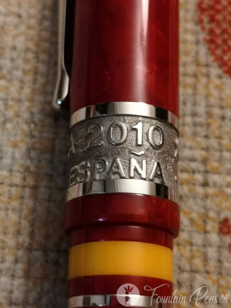En el cuerpo, desenroscando el culote acedemos al sistema de carga, un aro de color azul representa la segunda equipación de la Selección, acompañado de un aro rodiado, antes de llegar a la boquilla encontramos otro aro rodiado a partir del cual vemos un aro rojo, otro amarillo y uno más rojo, que señalan la bandera española; la boquilla, realizada en la misma resina que el resto de la pluma, tiene un plumín de oro de 18K., con baño de rodio, el sistema de carga es mediante botón de presión o button filler.