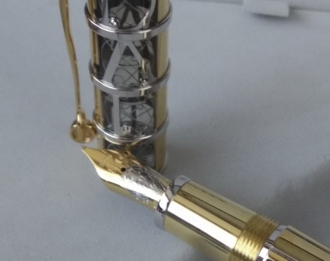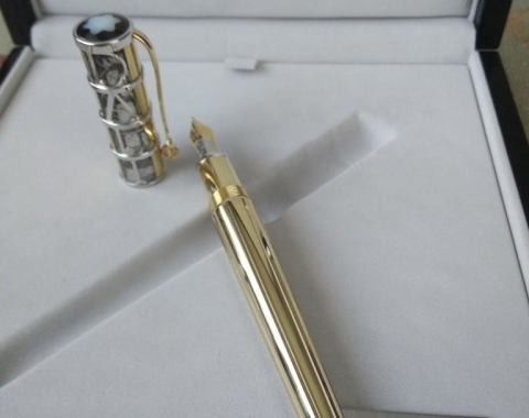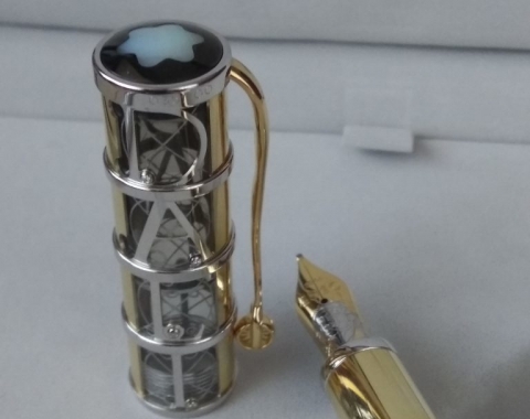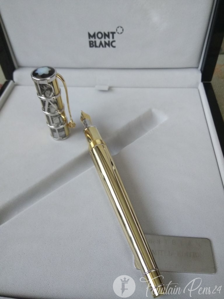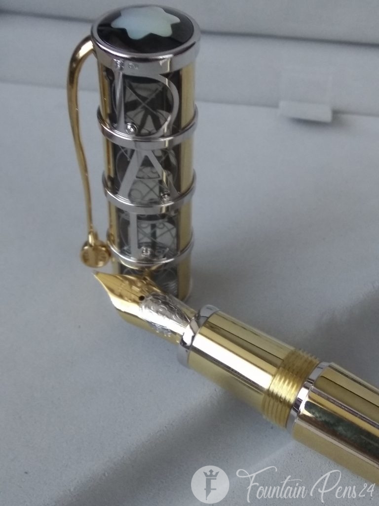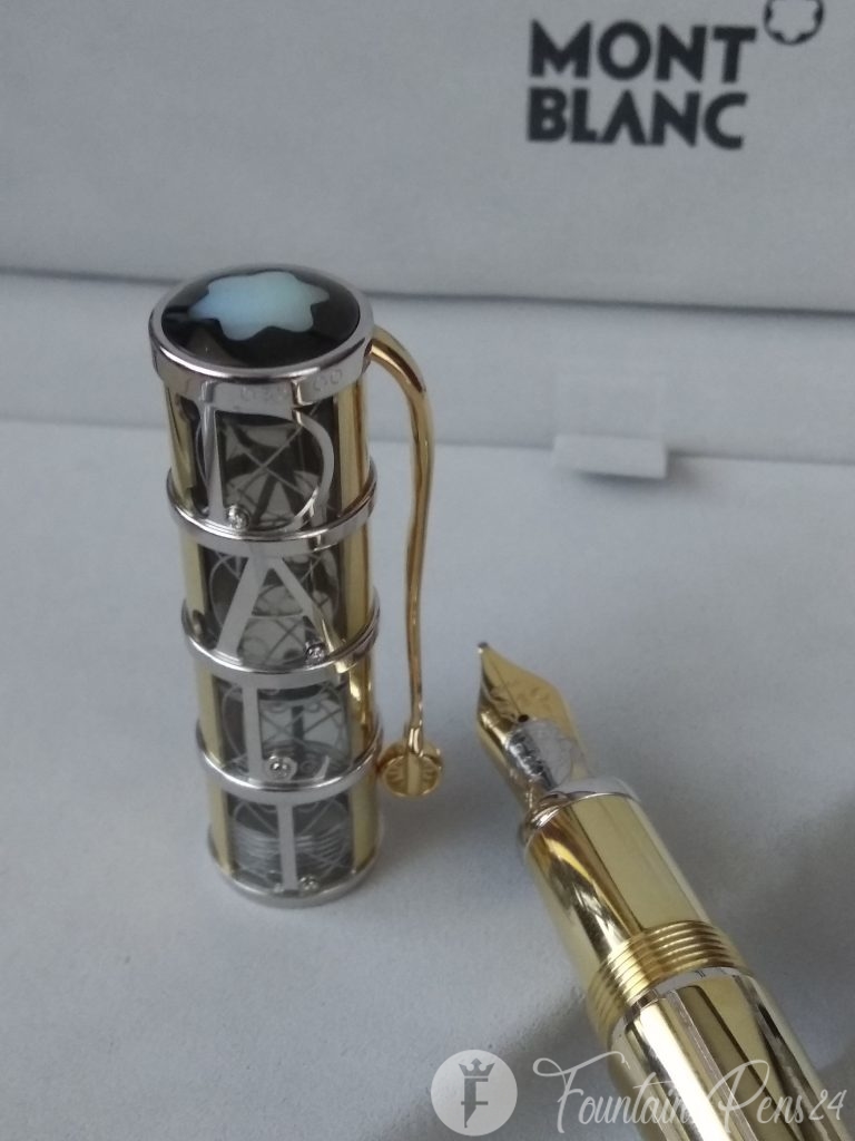 Inspired by the lines of perspective that are typical for Dali's works of art, a wavy guilloche pattern accentuates the tapering barrel of the 750 white and yellow gold fountain pen. The Montblanc star Mother of Pearl puts the finishing touch to the cone of the skeleton overlay cap, engraved with a filigree replica of Dali's signature. The clip of the fountain pen takes the form of a fork, a characteristic feature of many of his paintings, topped with a finely crafted wheel. With the masterfully worked portrait of Salvador Dali on the 18-carat gold nib and a limited edition of 100 pieces designed to commemorate the centennial of his birth this year, this edition pays tribute to an inmortal artist.