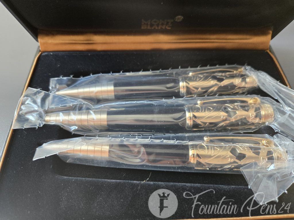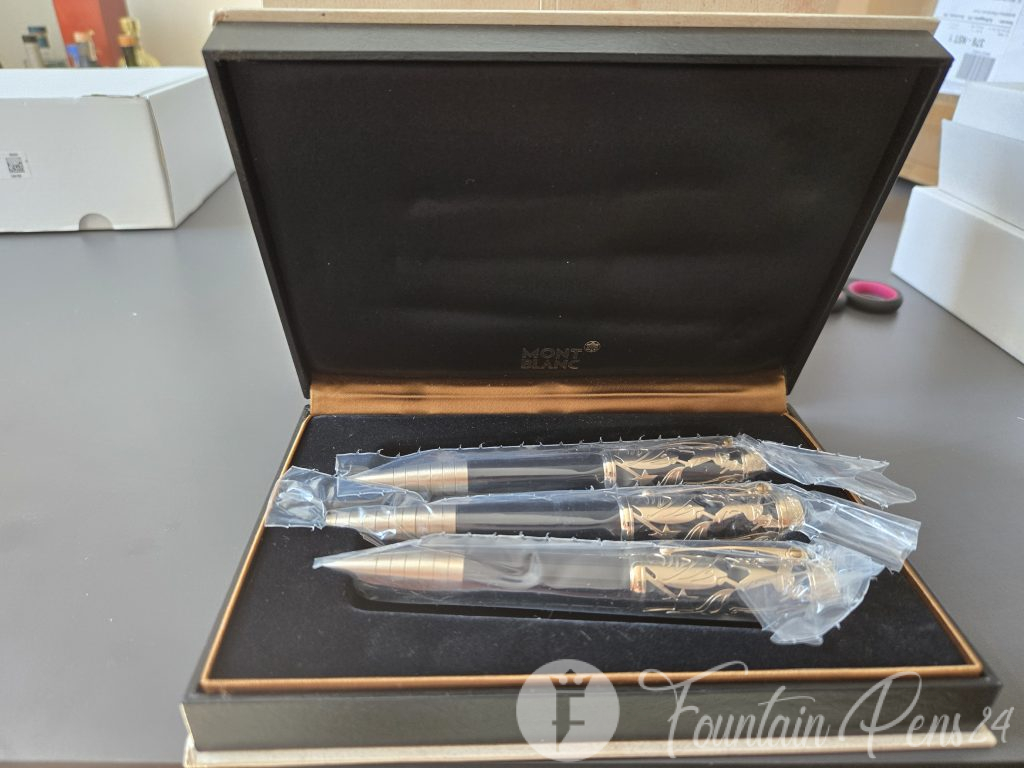 Complete and unused set consulting of fountain pen, ballpoint and mechanical pencil from the Motblanc Writers Edition.